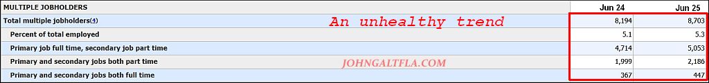 Worse the projected private sector job creation appears to be another miss as highlighted above as people look at the headline number but fail to see that the jobs being created are not enough for many people to survive on, thus the little over 500K increase year over year in multiple jobholders. From table A-16 of the report: