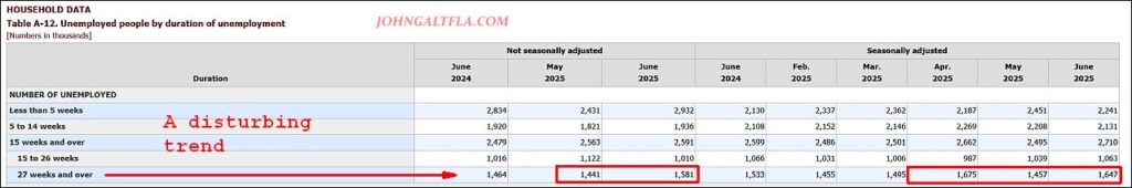 Another disturbing indicator is the relentless increase in people unemployed for over 27 weeks as the stagflationary effects appear to be impairing job creation with another jump higher after a seasonal blip in May.