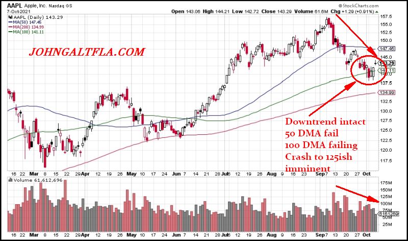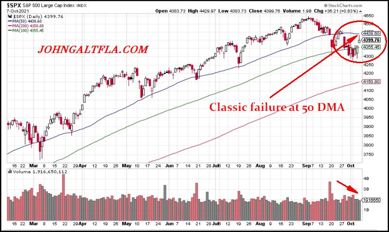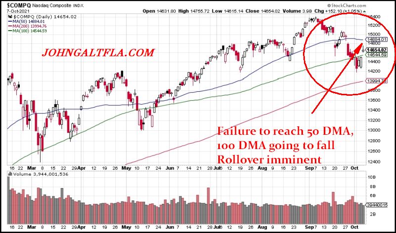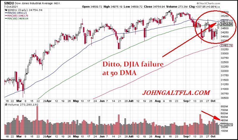 It’s almost as if a textbook demonstration of a bear market is being set up with a gap up in the morning, rally to the 50 day moving average, failure, the rollover like a fat dog wanting its belly rubbed. The DJIA did the same: