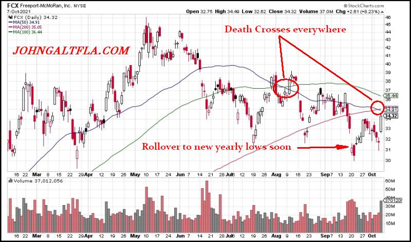 And what I wold consider a warning to the inflationistas, the raw materials sector is also sending warning signals as one of the largest miners in the world is showing signs of breaking down. Freeport McMoRan is hinting that an economic slowdown might be coming as it has broken down technically and the inflation trade may be ending it’s “transitory” course soon: