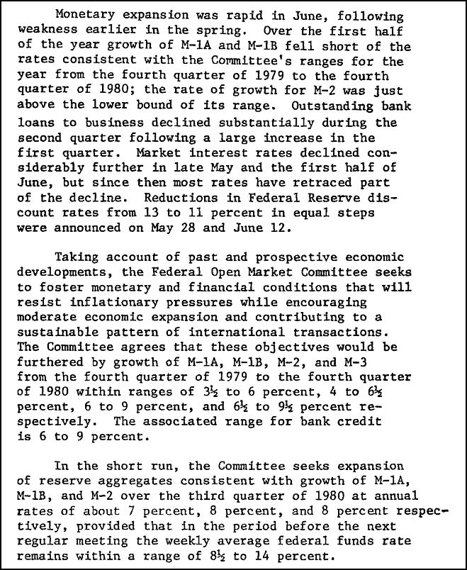 Let’s board the way back machine and read an excerpt from the FOMC statement from the July 1980 meeting: