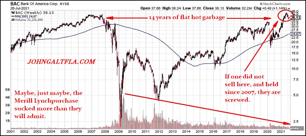 But what of those central bank member banks who played ball and purchased some of their sick brethren during the great crash? While Goldman and JP Morgan are soaring on the back of the Fedflation, Bank of America got stuck with an albatross called Merrill Lynch which did nothing for the equity valuations of BAC: