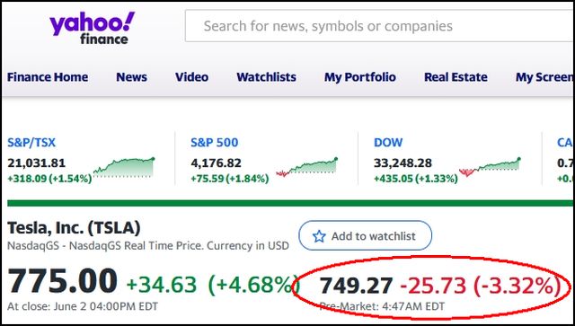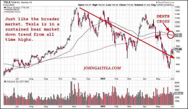 This morning in market trading, Tesla stock is already down 3%+ and will probably accelerate it’s move to the downside leading the entire market into a rout and end to the bear market bounce.