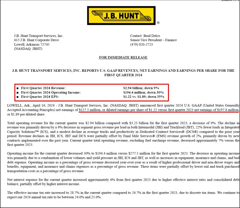 Late Tuesday afternoon the big boy of motor carriers, the legendary J.B. Hunt (Symbol: JBHT) reported their earnings today and the only good part about it was the final period at the end.