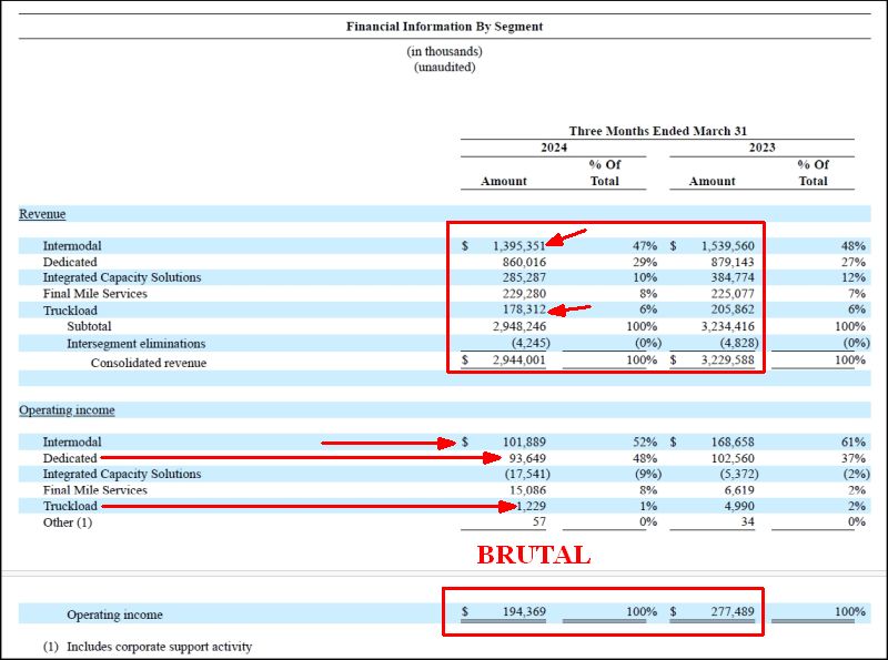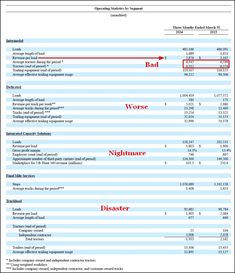 The arrows which highlighted particular segments are only important because it reflects the general economic situation nationally. J.B. Hunt operates across the country, not regionally, so for these types of declines reflected in their financials, this is a disaster and a hint as to how bad it is for the rest of the industry and worse, the railroads.