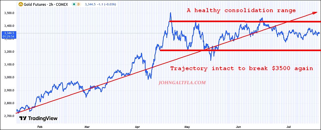 Which means as they break out of ranges or channels in the weeks ahead, much higher prices are on the horizon, especially if the President decides to monkey around with attempting a remake of the Federal Reserve in his image.