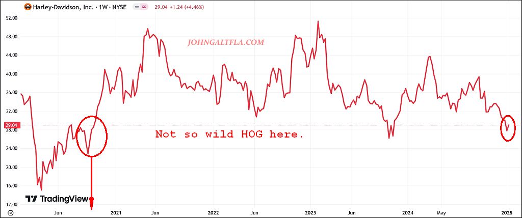 The motorcycle industry has been brutalized with higher interest rates and the venerable stock symbol of HOG is not immune. Sales down 10% in North America and 23% in through September 30, 2024 along with the accompanying 14-16% year over year projected lower revenues does not help.