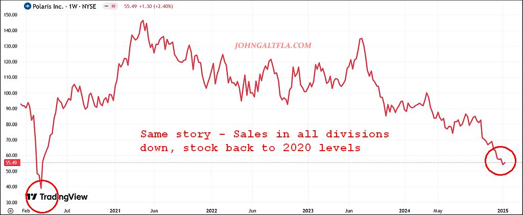 Polaris manufactures off road, on road, and watercraft (jet skis) for recreational and some work applications, mostly related to farming and land management. It was not a good report year over year as off road was down 24%, on road down 13%, and marine division down 36 through November 30, 2024.