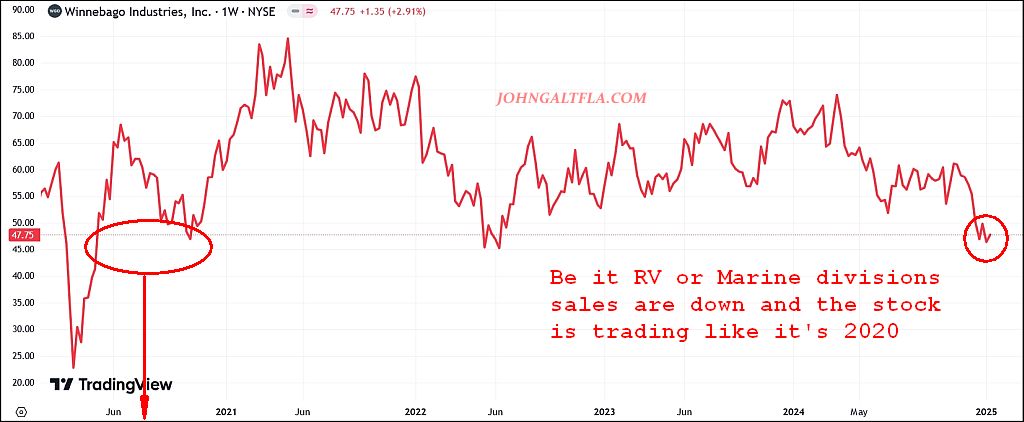 This is one unique animal which crosses over from the RV industry with their traditional brands and the marine industry since the acquisition of Chris Craft a few years ago. The best tracking metric is dealer inventories which in the RV division is divided into towables which were down 8.7% and motorhomes down 5.4%. Chris Craft dealer inventories dropped 16.6% year over year despite a bump in dealer sales in FY 25’s first quarter ending November 30, 2024.