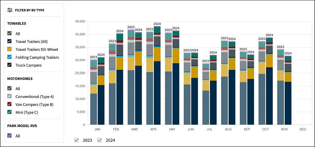 The data from the RVIA (Recreational Vehicle Industry Association) reported that sales were down overall 10.2% through the end of the third quarter of 2024. The numbers are somewhat diverse as the lower cost RV’s had more success in 2023 and 2024 than the higher priced fifth wheel, motor home, and park model variety as indicated in this chart below: