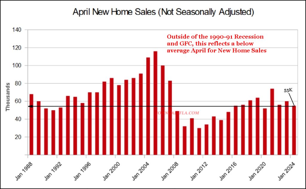 The headline announcement is provided to the financial and mainstream media as 634,000 new homes sold at an annual rate. What most people are too lazy to understand is that the real story was that the opening of the “spring home buying season” actually saw an unusual decline to only 55,000 new homes sold nationwide. Usually during April there is an uptick in activity so the slowdown in sales should be alarming to the Federal Reserve and those in charge of policy as it might indicate that the interest rate tricks might have run its course of qualified buyers for now.