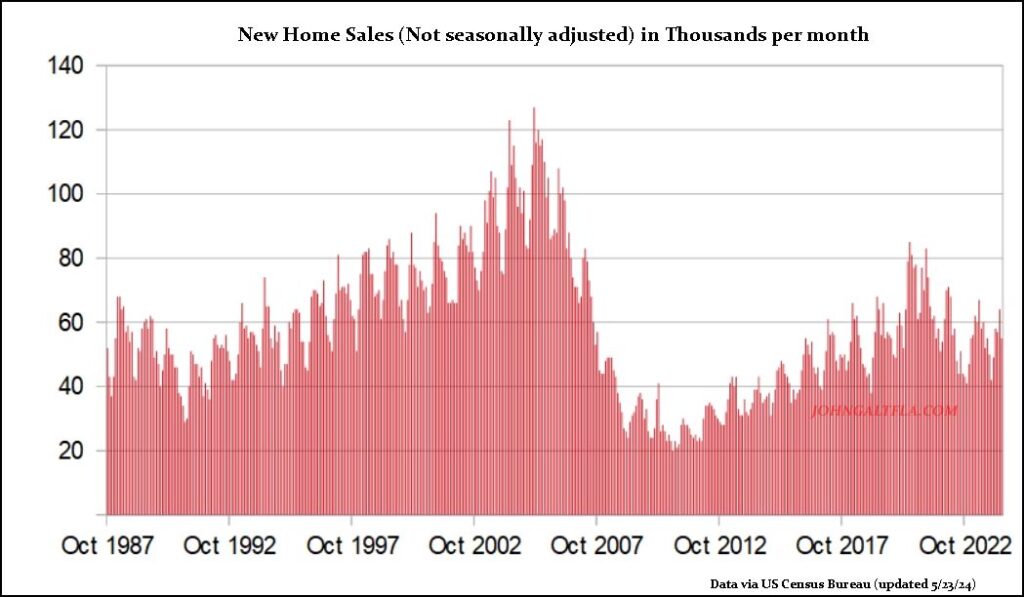 The following charts abandon the financial media and government’s favorite news release of SAAR or “Seasonally Adjusted Annual Rate” which sounds better many times than it actually is. For example, if one reads the report from the Census Bureau on New Home Sales, the press release says the following: