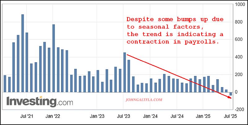Since the peak of inflation in 2023, there appears to be a non-stop contraction in private payrolls per ADP. Keep in mind they only measure reported private payrolls which are processed where reporting is visible to their data centers, a substantial data size when taken into account.