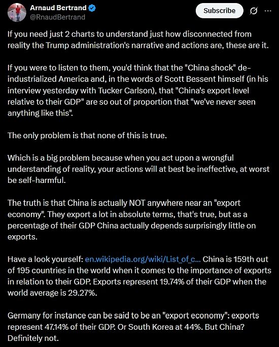 The reason for the decline in US was obvious to those of us in the 1990s, yet few paid attention. The outsourcing of our jobs, our corporations, and our technology created the conditions we now reap. As Arnaud Bertrand so eloquently posted on X the bogeyman of China is utter, complete nonsense now (excerpted):