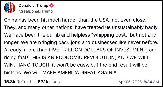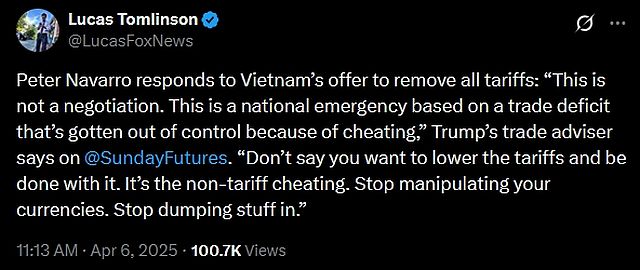 This should be a clear sign, along with all of the other rhetoric from his administration today, especially Peter Navarro, that there will be no negotiations until the US economy is potentially irretrievably broken.