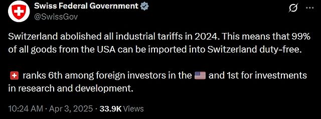 Nations which have long ago abandoned any precept of a trade dispute with the US were swept up into the retaliatory nature of the announcement a few days ago. For example, Switzerland which has virtually no tariffs on inbound US goods was zapped just because the US imports more watches, gold, and Swiss chocolate than, uh, er, Fords (I guess) to their country.