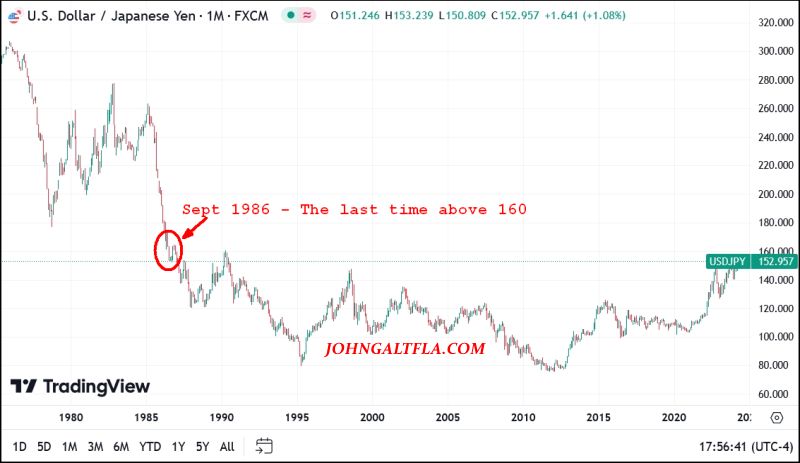 A break of 160 resets everything in commodity, bond, and equity markets on a global scale because the Bank of Japan, ECB, etc. will all have to engage in a massive intervention and that is never a good thing for free markets. 1986 was a good year, but the years where the Yen traded above 200 were so to say, not so hot for the United States as the inflation of the 1970’s was brutal.