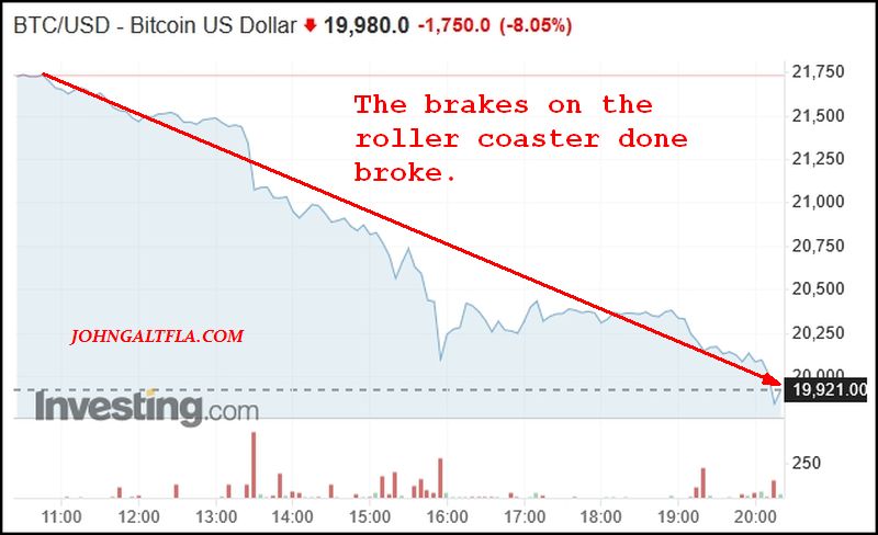 But worse is the crypto picture tonight as what ever went boink this afternoon has resulted in massive selling in Bitcoin and across the cryptocurrency universe: