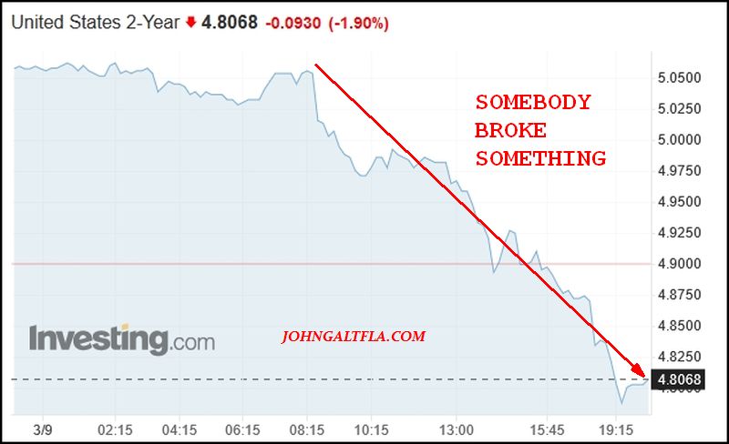 In an obvious flight to safety, here is the US 2 year Treasury trading like Bear Stearns is collapsing all over again with a solid 25 bps drop in yields since early this morning: