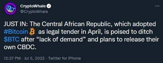 Thankfully, most cryptogeeks can not find the CAR on a map, much less understand why this important. However they will understand CryptoWhale‘s second important Tweet tonight: