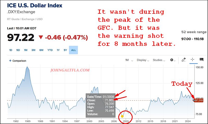 That was just 17 years ago. Imagine the reaction if we were to watch a crash like we did from 2003 to 2008 in the next 6 months. Then you can freak out and I’ll be right there with everyone. At that moment, as we were all concerned as to how in the world Bear Stearns, Goldman Sachs, Countrywide, and Indymac would survive, as no one wanted to own, hold or even be anywhere near the dollar or its assets as a complete financial system collapse in the United States looked like a realistic possibility.