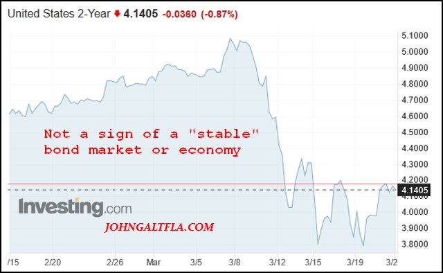 Naturally this is the highest probability now and if I were playing the markets today, that is how I would proceed. The “pause” would create reassurance that the Fed is aware of the financial instability in the banking system, but once again illustrate Powell’s inability to understand basic economics and the impacts of monetary policy on the global financial system. Odds of this happening: 40%