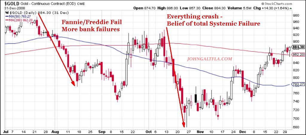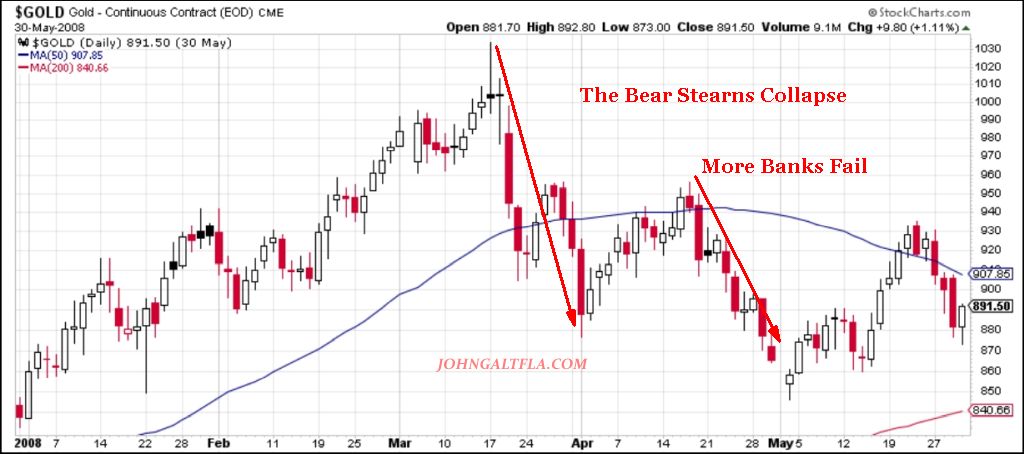 Why would gold sell off during the Bear implosion? Simple, investors and financial institutions needed to raise cash in a hurry and gold is one of the most liquid markets on earth. Thus when more banks failed in April, it became apparent cash wasn’t king, but raising cash to meet margin calls and cover for other financial issues was.