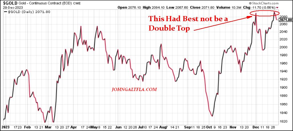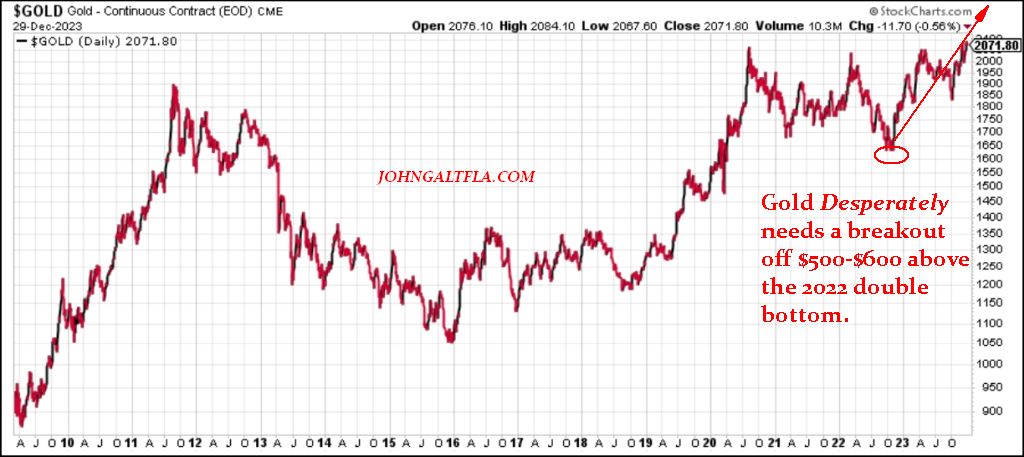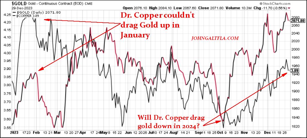Heading into 2024, copper does not appear to be building a bull case for a steady or growing global economy despite supply shortages. The collapse of the “green” trade which was supposed to keep copper demand above normal for decades was nothing more than a fallacy and copper traders recognized that with the price collapse in May of this year. Will Dr. Copper once again take its role in leading precious metals up or down in 2024? That has yet to be determined but the price action needs to exceed the January 2023 price levels to confirm a move to new all time highs in gold.