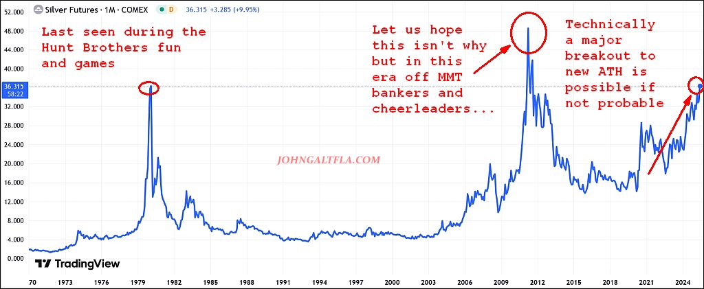 The amount of shorts on silver contract futures has always been as ‘nekkid’ as the chicks at the Mons Venus in Tampa (or so I’ve heard) and now with silver on breakout velocity there is panic in the shorting community.