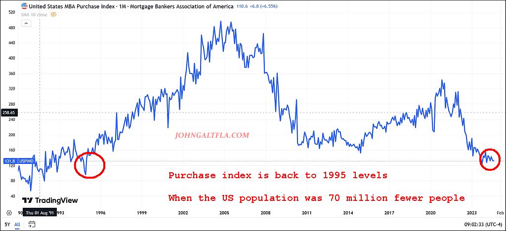 For example, every Wednesday the Mortgage Bankers Association (MBA) releases data on mortgage rates, new mortgages for home purchases, and of course refinancing. The data this week is summed up in the chart below, which should shock anyone with a basic understand of demographics and finance.