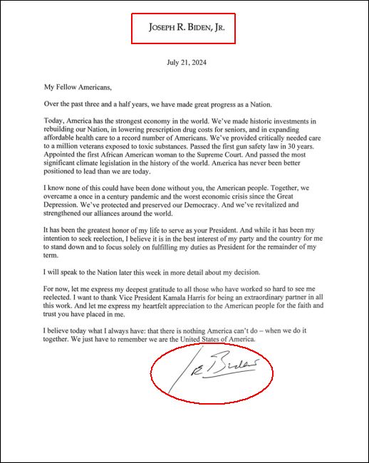 The two issues I’ve noticed are obvious and highlighted above. Firstly, it was written on personal, not White House or even campaign letterhead. If anything it should have been issued on campaign letterhead at a minimum, as it was related to his re-election and this appears to be a last minute hastily issued statement. Secondly, the machine or digitally issued signature does not match any known signatures for President Biden. There are no known signatures where he underlines his name.