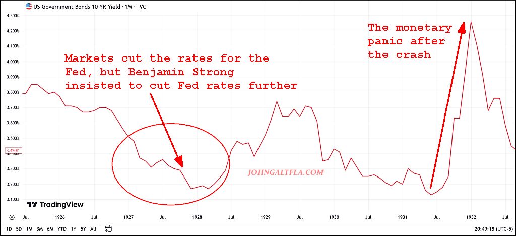 The 1927 cut resulted in the greatest land and stock market boom until the next one some 80 years later. The excerpt below is from The Chicago Fed History: 1915-1939 tells the tale of how the Fed evolved and mistakes are walked into despite the best intentions: