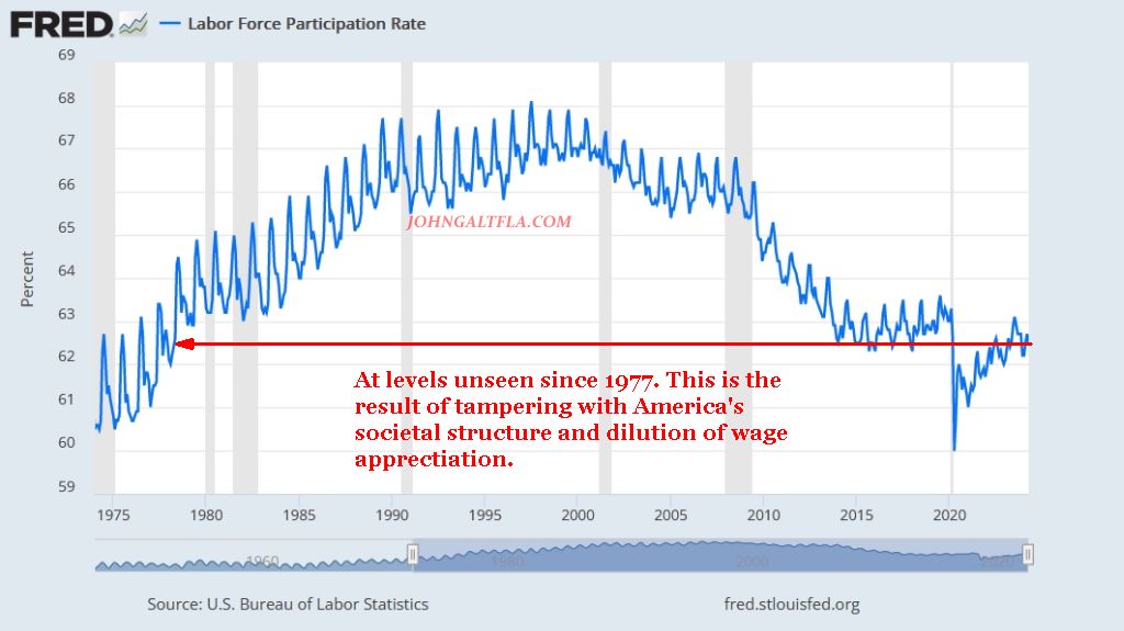 Meanwhile the Labor Participation Rate has also deteriorated to Carter era like levels.