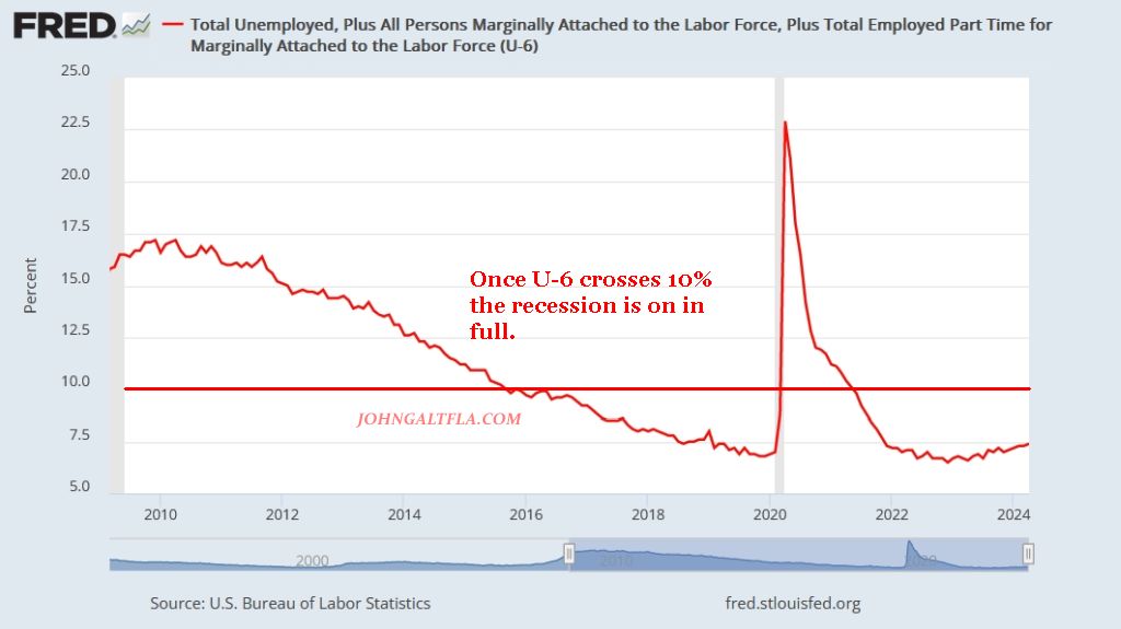 Thus when the U-6 unemployment rate number starts to creep up and heads past 10% it is time to pay attention.