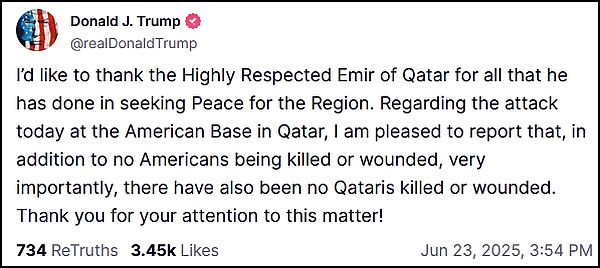 In response to the aggressive and brazen action carried out by the United States against Iranian nuclear sites and facilities, the powerful armed forces of the Islamic Republic of Iran have struck Al Udeid Air Base where American forces are stationed in Qatar. The number of missiles used in this successful operation equals the number of bombs used by the United States in its attack on Iranian nuclear facilities, and a military base completely distant from residential areas and civilian facilities in Qatar was targeted. This action carries no dangerous nature toward the friendly and brotherly state of Qatar and its honorable people, and the Islamic Republic of Iran affirms its commitment to maintaining and continuing the warm and historical relations with Qatar.