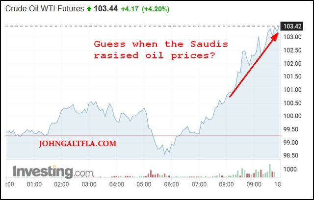 WTI Crude on the NYMEX took off of course back to over $103 per barrel in very short order: