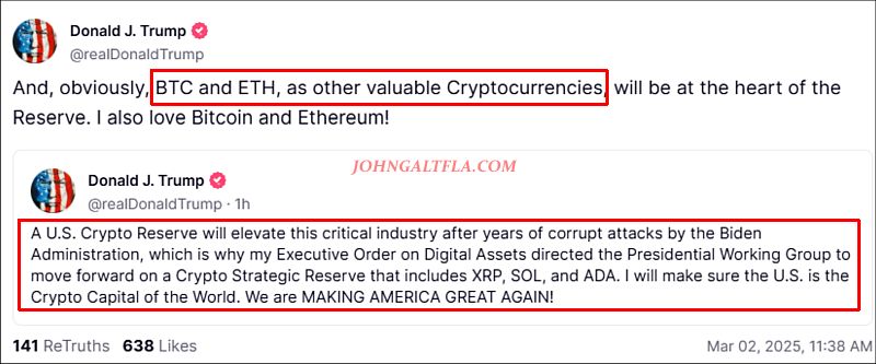 This executive order President Trump refers to carries no weight in law, does nothing to introduce a cryptocurrency reserve beyond studying the feasibility of such, and appears to be nothing more than a promotional move to pump up flailing prices on speculative assets for some of the administration’s friends; especially the second tier cryptocurrencies.