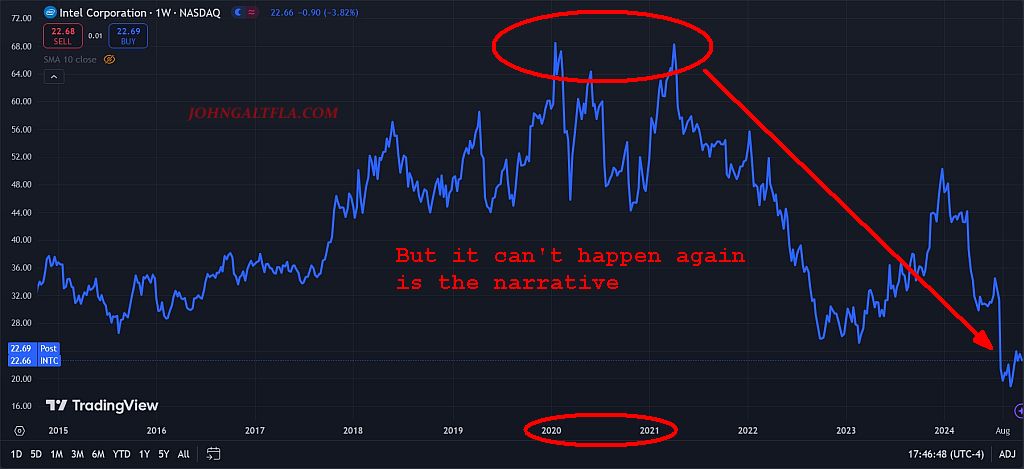 But what stock has repeated this feat that still trades today? Believe it or not the once high flying high tech company Intel again: