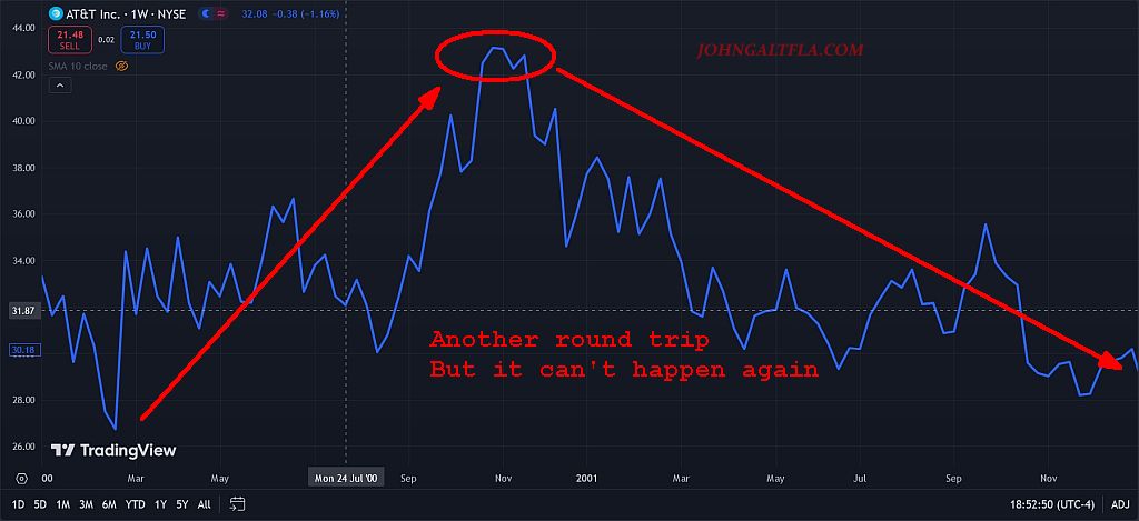Traditional telecom companies were caught up in the same frenzy. Just look at what happened to AT&T($T) during the same period, but not with as dramatic an outcome as Intel.
