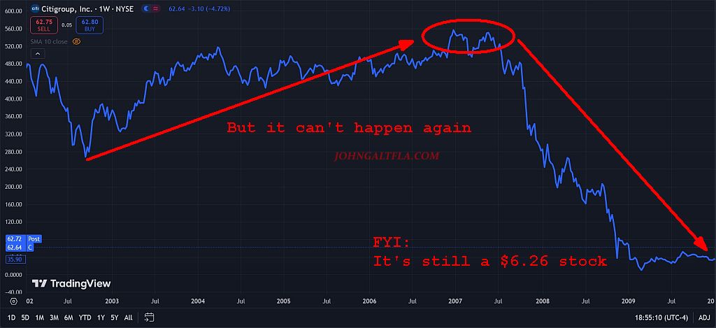 In some cases, the equities never recover their full valuations as Citigroup ($C) has demonstrated: