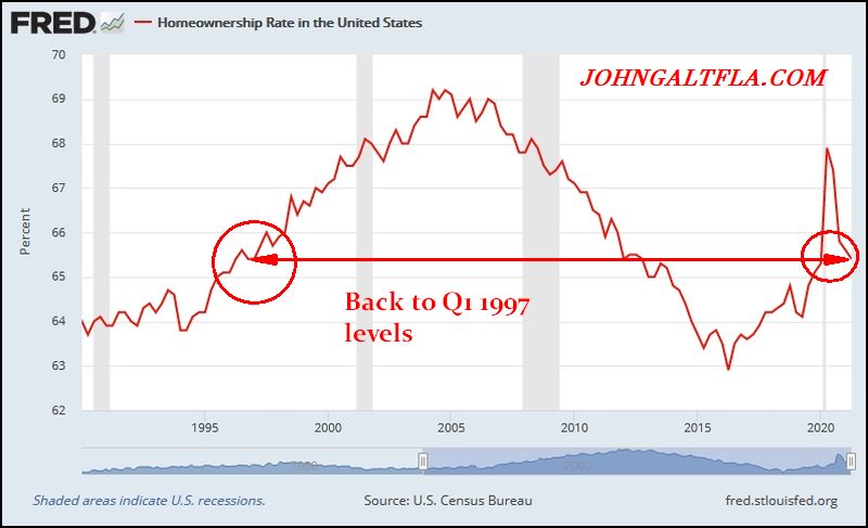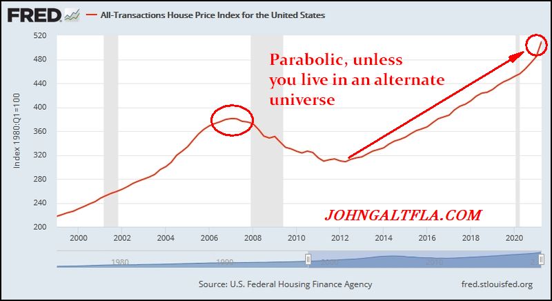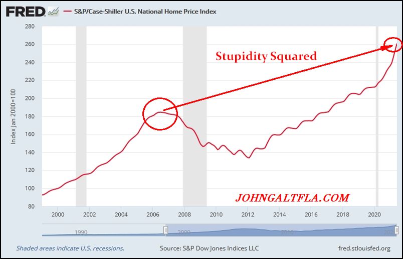 Something in this formula does not fit, that being the Federal Reserve’s excess printing which has enabled speculation in cryptocurrency, equities, and of course housing. Instead of fixing the problems from 2005-2009, the government has doubled down, enabling a new generation of idiots to speculate and believe that “housing prices never go down” and other such nonsense.