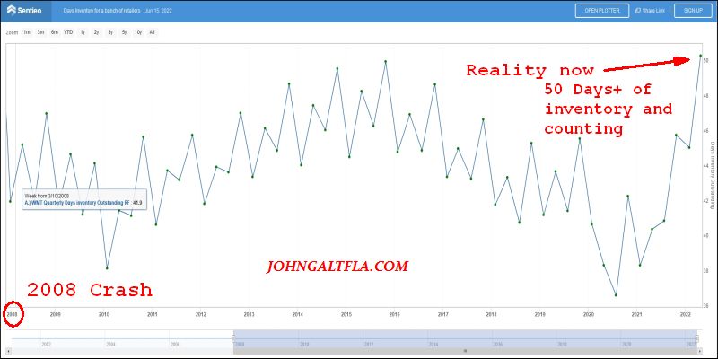 Apparently old Jim doesn’t get out very much and in the real world, evidence of a decline in economic activity is everywhere including the start of layoffs and hiring freezes. Oh, and the inventory chart of what retailers have on hand isn’t exactly bullish: