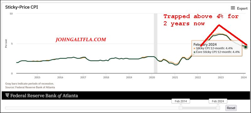 However the reality is that if one uses the much more relatable and reliable Atlanta Fed Sticky Price-CPI annualized rate it is still trapped above the 4% level for 2 years now.