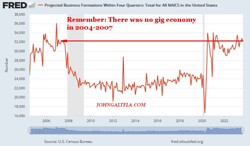 If the population is not expanding at a fast rate and many citizens are choosing the gig economy now for economic survival, one has to ask just how bad the quality of business formation is now, and what happens to these “gig” workers when a real economic contraction occurs.