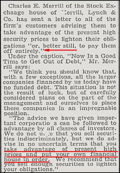 On April 1, 1928, one of the most famous letters in Wall Street financial history was published by the New York Times from Charles Merrill, the one and only of Merrill Lynch fame. The excerpt below was meant to send a warning to individual investors that the dangers of speculation and leverage will eventually lead to a crash.
