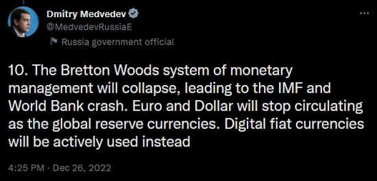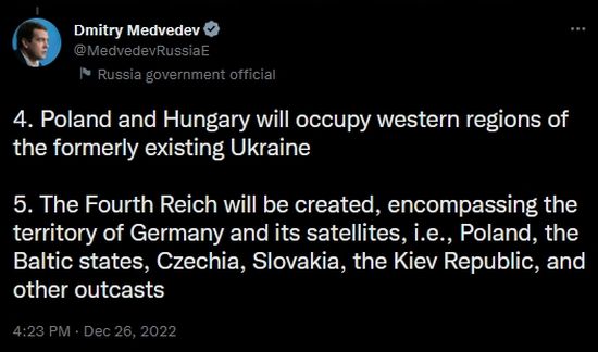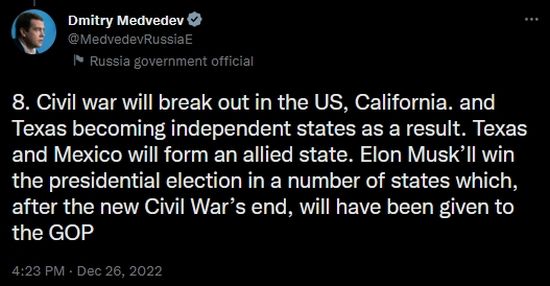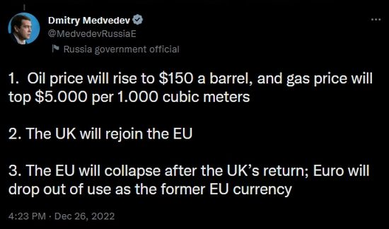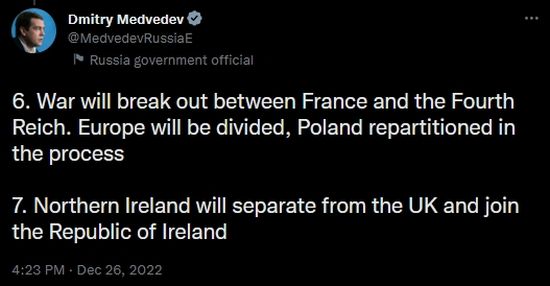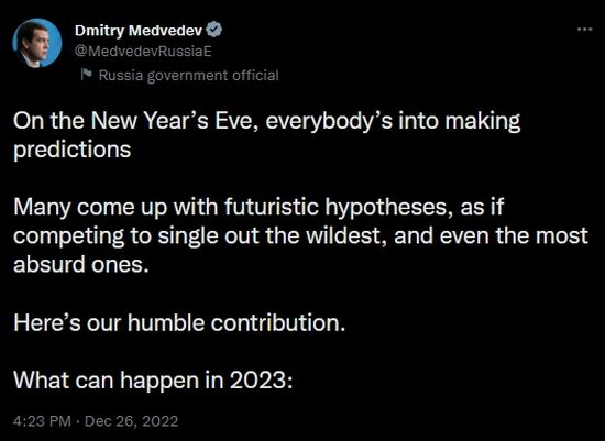 Just as I am preparing to unleash my semi-accurate wowser predictions for 2023, along comes former Russian President Demitry Medvedev to go full on Alex Jones, hell, Art Bell on the world.
