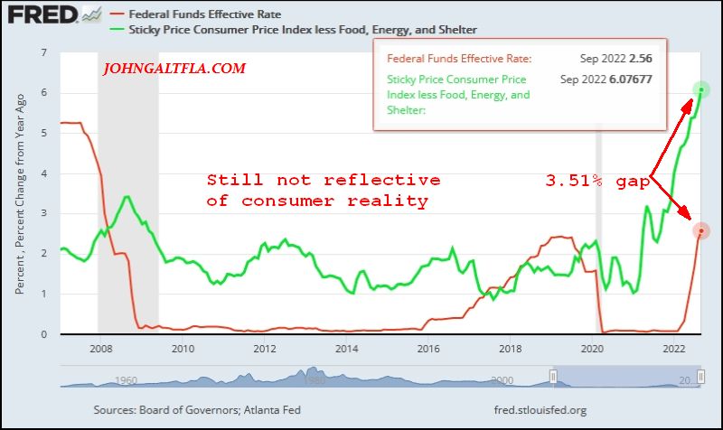 The effective Fed Funds rate is not even close to the official inflation rate of 8.2% from September per the BLS nor the sticky CPI from the Atlanta Fed: