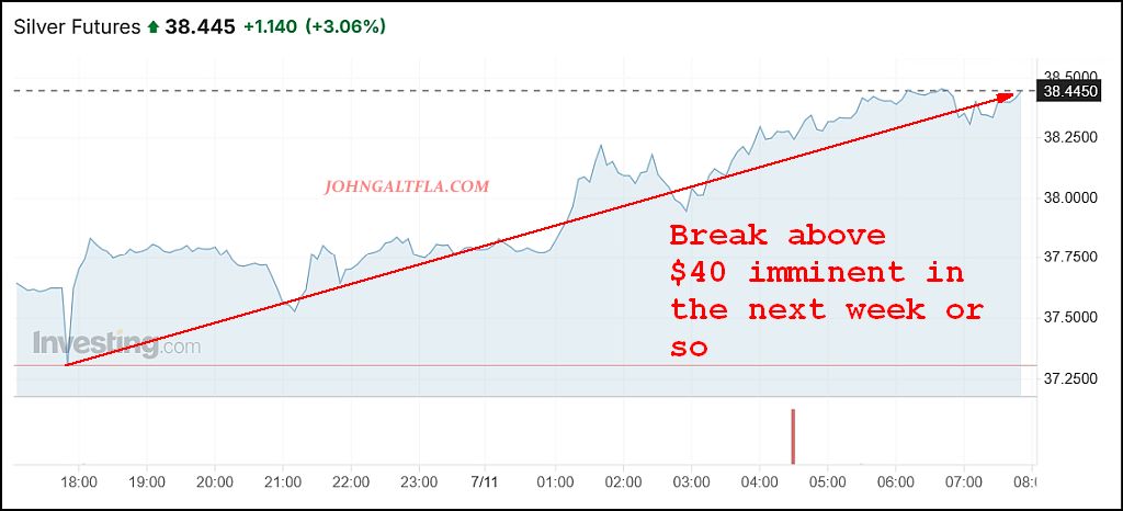 With that being said, watch for the next breakout above $40, probably by the end of next week, a rocket ship to the $48 area and then prepare for the Silver Panicans to take the price to insane levels as shorts and retail realize they have contracted FOMO disease.
