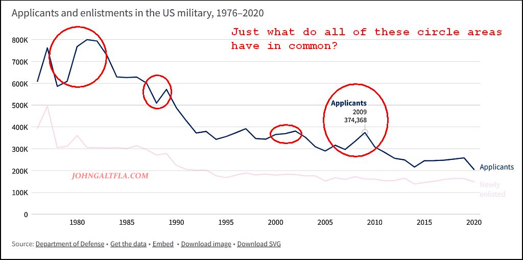 God bless them for serving, but the headlines and “patriotic” Trump pumping doesn’t pass the smell test. It appears to this author that once again, America is heading for a deep recession and the smart young men and women are seeking a steady paycheck, benefits, and training that the private sector can not provide.