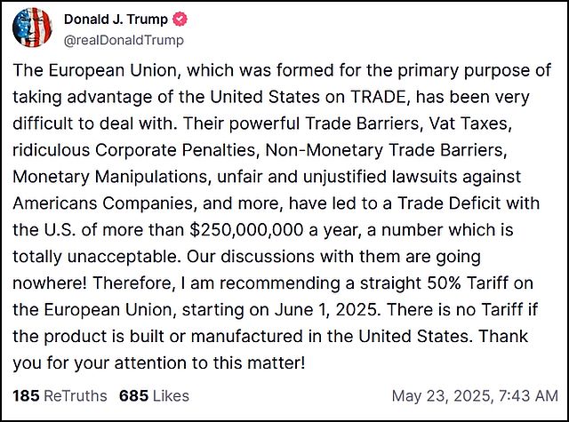 Of course President Trump followed up to that posting with another one at 7:43 a.m. where he unloads on the European Union: